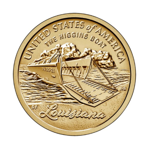 Moneta jednodolarowa (1 Dollar) USA - Barka desantowa, wyemitowana w 2023 roku.Jest to moneta z serii Amerykańska Innowacja. Nazwa oryginalna: $1 Coin Louisiana - Higgins Boat.Na awersie monety znajduje się wizerunek Statuy Wolności, a także napis „IN GOD WE TRUST” oraz nominał „$1”. Na awersie znajduje się także dyskretny znak stylizowanego koła zębatego, symbolizującego przemysł i innowację.Rewers monety przedstawia łódź Higginsa w takiej postaci, w jakiej została użyta podczas II wojny światowej, z innowacyjną na ówczesne czasy rampą do lądowania na otwartą plażę. Dodatkowo rewers zawiera nazwę stanu Louisiana oraz napis „United States of America”.Na rancie umieszczono rok emisji, znak menniczy, 13 gwiazdek oraz wezwanie E pluribus unum z Wielkiej Pieczęci Stanów Zjednoczonych. Napis układa się w następujący sposób: ★★★★★★★★★★ 2023 D/P ★★★ E PLURIBUS UNUM.Ważne ! Monety z tej serii są wybijane w dwóch mennicach: w Denver (Literka D) lub w Filadelfii (Literka P). Nad przyciskiem do koszyka można wybrać mennicę kupowanej monety (domyślnie jest to D - Denver). Oznaczenia mennic na monetach w tej serii znajdują się na rancie przy roku wybicia.