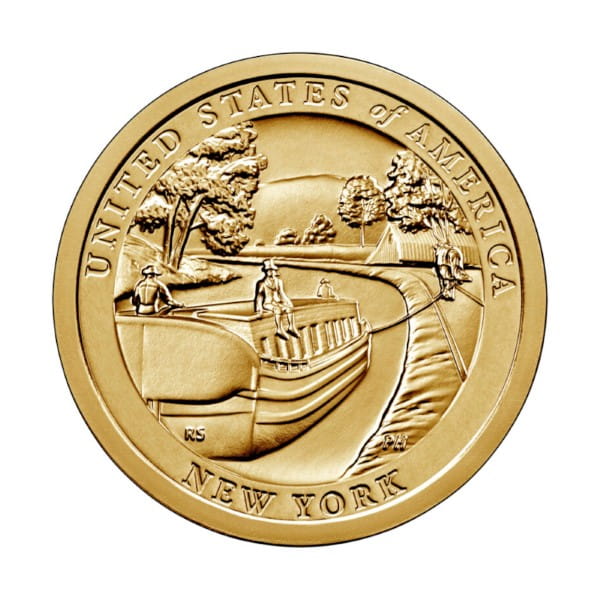 Moneta jednodolarowa (1 Dollar) USA - Kanał Erie, wyemitowana w 2021 roku.Jest to moneta z serii Amerykańska Innowacja. Nazwa oryginalna: $1 Coin New York - Erie Canal.Na awersie monety znajduje się wizerunek Statuy Wolności, a także napis „IN GOD WE TRUST” oraz nominał „$1”. Na awersie znajduje się także dyskretny znak stylizowanego koła zębatego, symbolizującego przemysł i innowację.Rewers monety ukazuje łódź transportową ciągniętą z miasta na wschodzie w kierunku obszarów wiejskich na zachodzie. Dodatkowo rewers zawiera nazwę stanu New York oraz napis „United States of America”.Na rancie umieszczono rok emisji, znak menniczy, 13 gwiazdek oraz wezwanie E pluribus unum z Wielkiej Pieczęci Stanów Zjednoczonych. Napis układa się w następujący sposób: ★★★★★★★★★★ 2021 D/P ★★★ E PLURIBUS UNUM.Ważne ! Monety z tej serii są wybijane w dwóch mennicach: w Denver (Literka D) lub w Filadelfii (Literka P). Nad przyciskiem do koszyka można wybrać mennicę kupowanej monety (domyślnie jest to D - Denver). Oznaczenia mennic na monetach w tej serii znajdują się na rancie przy roku wybicia.
