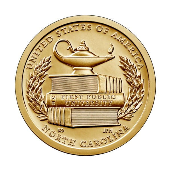 Moneta jednodolarowa (1 Dollar) USA - Pierwszy uniwersytet publiczny, wyemitowana w 2021 roku.Jest to moneta z serii Amerykańska Innowacja. Nazwa oryginalna: $1 Coin North Carolina - First public university.Na awersie monety znajduje się wizerunek Statuy Wolności, a także napis „IN GOD WE TRUST” oraz nominał „$1”. Na awersie znajduje się także dyskretny znak stylizowanego koła zębatego, symbolizującego przemysł i innowację.Rewers monety przedstawia stos trzech podręczników z napisem „FIRST PUBLIC UNIVERSITY” na grzbiecie środkowej ksiązki. Lampa, kaganek wiedzy stoi na szczycie książek, a całość otaczają gałązki oliwne. Dodatkowo rewers zawiera nazwę stanu North Carolina oraz napis „United States of America”.Na rancie umieszczono rok emisji, znak menniczy, 13 gwiazdek oraz wezwanie E pluribus unum z Wielkiej Pieczęci Stanów Zjednoczonych. Napis układa się w następujący sposób: ★★★★★★★★★★ 2021 D/P ★★★ E PLURIBUS UNUM.Ważne ! Monety z tej serii są wybijane w dwóch mennicach: w Denver (Literka D) lub w Filadelfii (Literka P). Nad przyciskiem do koszyka można wybrać mennicę kupowanej monety (domyślnie jest to D - Denver). Oznaczenia mennic na monetach w tej serii znajdują się na rancie przy roku wybicia.