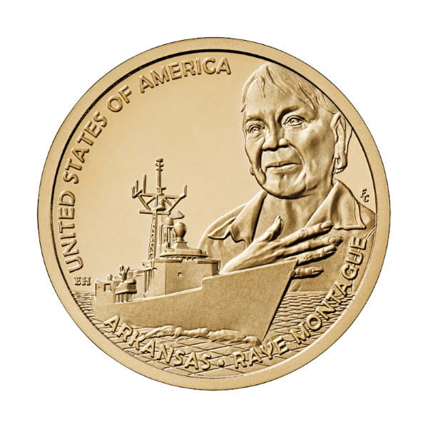 Rewers monety przedstawia Raye Montague oraz wizualizację modelu fregaty United States Navy klasy Oliver Hazard Perry, okrętu zaprojektowanego przez nią komputerowo. Wzór siatki na morzu przywołuje techniki inżynieryjne i kreślarskie, które zdigitalizowała, aby zrealizować swój projekt. Dodatkowo rewers zawiera nazwę stanu Arkansas oraz napis „United States of America”.