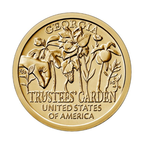 Moneta jednodolarowa (1 Dollar) USA - The Trustees’ Garden, wyemitowana w 2019 roku.Jest to moneta z serii Amerykańska Innowacja. Nazwa oryginalna: $1 Coin Georgia - Trustees' Garden.Na awersie monety znajduje się wizerunek Statuy Wolności, a także napis „IN GOD WE TRUST” oraz nominał „$1”. Na awersie znajduje się także dyskretny znak stylizowanego koła zębatego, symbolizującego przemysł i innowację.Rewers monety reprezentuje stan Georgia i honoruje Ogród Powierników, założony przez Jamesa Oglethorpe'a na początku lat trzydziestych XVIII wieku.Motyw przedstawia rękę sadzącą nasiona w napisie „Trustees' Garden”, z których wyrastają różne rośliny uprawiane w ogrodzie tj. sadzonka drzewa pomarańczowego, sasafras, winogrona, morwa biała, len, brzoskwinie, oliwka. Dodatkowo rewers zawiera nazwę stanu Georgia oraz napis „United States of America”. Na rancie umieszczono rok emisji, znak menniczy, 13 gwiazdek oraz wezwanie E pluribus unum z Wielkiej Pieczęci Stanów Zjednoczonych. Napis układa się w następujący sposób: ★★★★★★★★★★ 2019 D/P ★★★ E PLURIBUS UNUM.Ważne ! Monety z tej serii są wybijane w dwóch mennicach: w Denver (Literka D) lub w Filadelfii (Literka P). Nad przyciskiem do koszyka można wybrać mennicę kupowanej monety (domyślnie jest to D - Denver). Oznaczenia mennic na monetach w tej serii znajdują się na rancie przy roku wybicia.