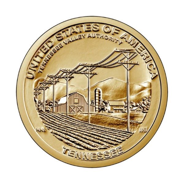Moneta jednodolarowa (1 Dollar) USA - Zarząd Doliny Tennessee, wyemitowana w 2022 roku.Jest to moneta z serii Amerykańska Innowacja. Nazwa oryginalna: $1 Coin Tennessee - Tennessee Valley Authority and rural electrification.Na awersie monety znajduje się wizerunek Statuy Wolności, a także napis „IN GOD WE TRUST” oraz nominał „$1”. Na awersie znajduje się także dyskretny znak stylizowanego koła zębatego, symbolizującego przemysł i innowację.Rewers monety ukazuje farmę w Tennessee wraz z zainstalowanymi liniami energetycznymi przebiegającymi wzdłuż drogi. Dodatkowo rewers zawiera nazwę stanu Tennessee oraz napis „United States of America”.Na rancie umieszczono rok emisji, znak menniczy, 13 gwiazdek oraz wezwanie E pluribus unum z Wielkiej Pieczęci Stanów Zjednoczonych. Napis układa się w następujący sposób: ★★★★★★★★★★ 2022 D/P ★★★ E PLURIBUS UNUM.Ważne ! Monety z tej serii są wybijane w dwóch mennicach: w Denver (Literka D) lub w Filadelfii (Literka P). Nad przyciskiem do koszyka można wybrać mennicę kupowanej monety (domyślnie jest to D - Denver). Oznaczenia mennic na monetach w tej serii znajdują się na rancie przy roku wybicia.
