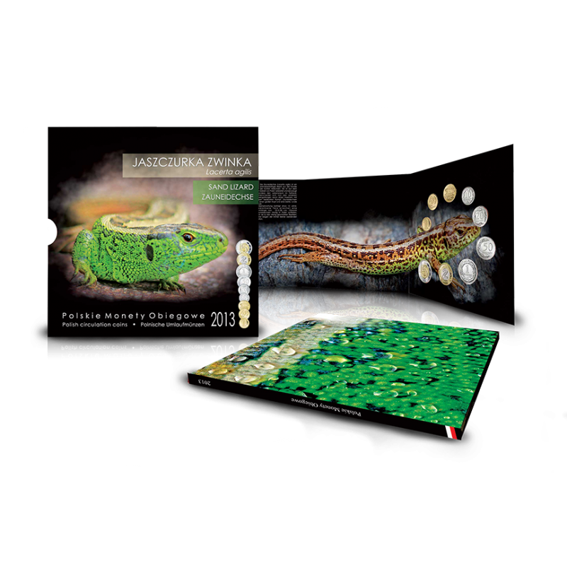 Blister - Polskie Monety Obiegowe "Jaszczurka zwinka" zawiera zestaw 9 monet o nominałach od 1 gr do 5 zł wybitych w 2013 roku (wyjątek stanowią 2 monety o nominale 2 zł oraz 5 zł, które mają rok 2009 wybity, ponieważ nie było ich emisji w 2013 roku).