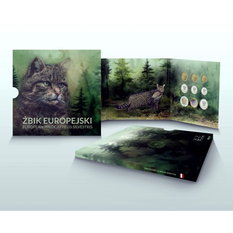 Blister - Polskie Monety Obiegowe "Żbik Europejski" zawiera zestaw 9 monet o nominałach od 1 gr do 5 zł wybitych w 2023 roku.