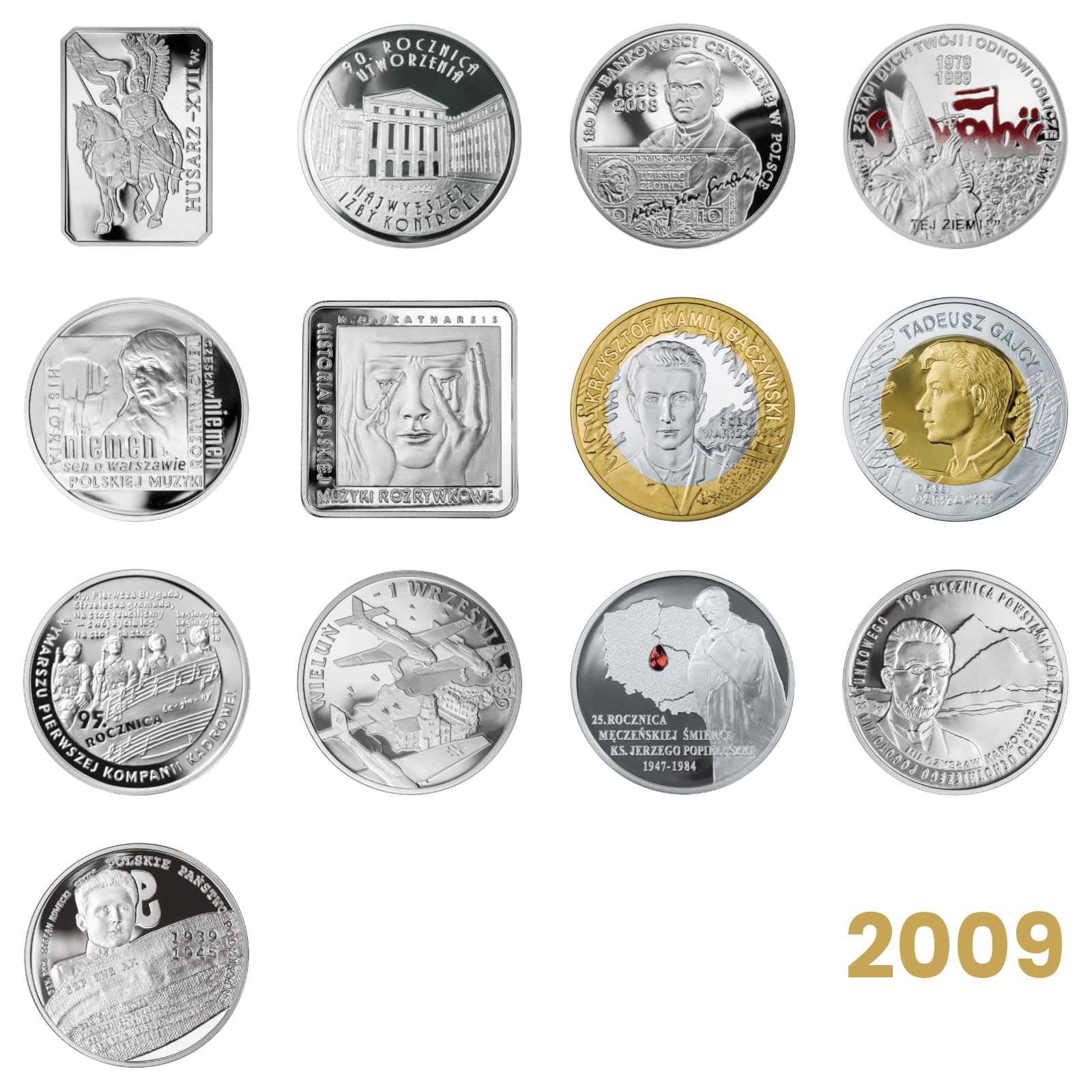 Komplet monet kolekcjonerskich 10 złotych - 2009 rok W skład zestawu wchodzą wszystkie monety o nominale 10 zł wyemitowane przez Narodowy Bank Polski w 2009 roku: Historia Jazdy Polskiej: Husarz XVII wiek 90. rocznica utworzenia Najwyższej Izby Kontroli 180 lat bankowości centralnej w Polsce Polska droga do wolności: Wybory 4 czerwca 1989 r. Historia Polskiej Muzyki Rozrywkowej: Czesław Niemen (okrągła) Historia Polskiej Muzyki Rozrywkowej: Czesław Niemen (klipa) 65. rocznica Powstania Warszawskiego - poeci warszawscy: Krzysztof Kamil Baczyński 65. rocznica Powstania Warszawskiego - poeci warszawscy: Tadeusz Gajcy 95. rocznica wymarszu Pierwszej Kompanii Kadrowej Wrzesień 1939 r. 25. rocznica męczeńskiej śmierci księdza Jerzego Popiełuszki 100. rocznica powstania TOPR 70. rocznica utworzenia Polskiego Państwa Podziemnego