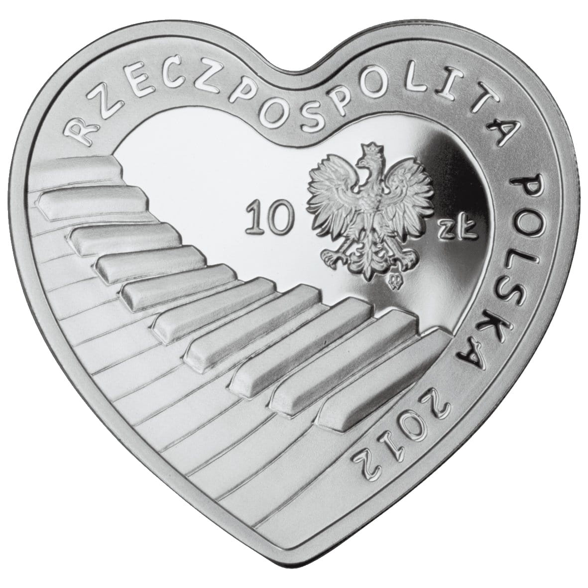 Moneta kolekcjonerska 10 złotych Wielka Orkiestra Świątecznej Pomocy - 20 lat Moneta została wyemitowana, aby upamiętnić 20 lecie Wielkiej Orkiestry Świątecznej Pomocy. Moneta jest w kształcie serca. Na rewersie widnieje fragment gitary, której górną część gryfu tworzą wizerunki serduszek. Na awersie monety został przedstawiony wizerunek klawiatury fortepianu. Moneta została również wyemitowana jako moneta okolicznościowa o nominale 2 zł. Zobacz również wszystkie wyemitowane w 2012 roku monety o nominale 10 zł.