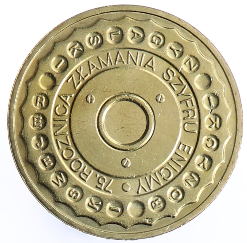 Moneta została wyemitowana, aby upamiętnić 75 rocznicę złamania szyfru Enigmy. Na rewersie znajduje się koło wirnika szyfrującego Enigmy.