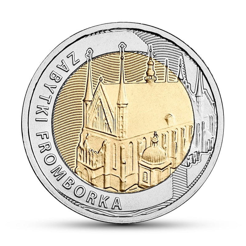 Została wybita z dwóch stopów (pierścień z miedzioniklu, rdzeń z brązu aluminiowo-niklowego), podobnie jak w przypadku innych obiegowych monet o nominale 5 zł. Na rewersie widnieje wizerunek bazyliki archikatedralnej Wniebowzięcia NMP i św. Andrzeja Apostoła we Fromborku.