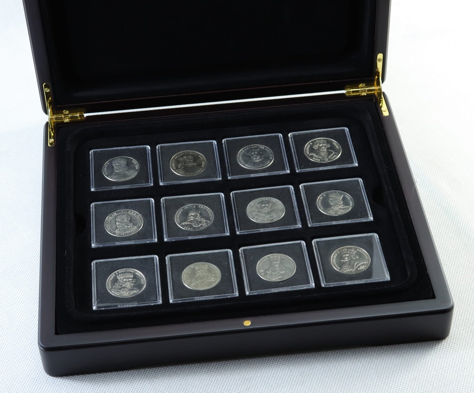 Monety umieszczone w kapslach quadrum, a całość zapakowana w ekskluzywne drewniane etui.